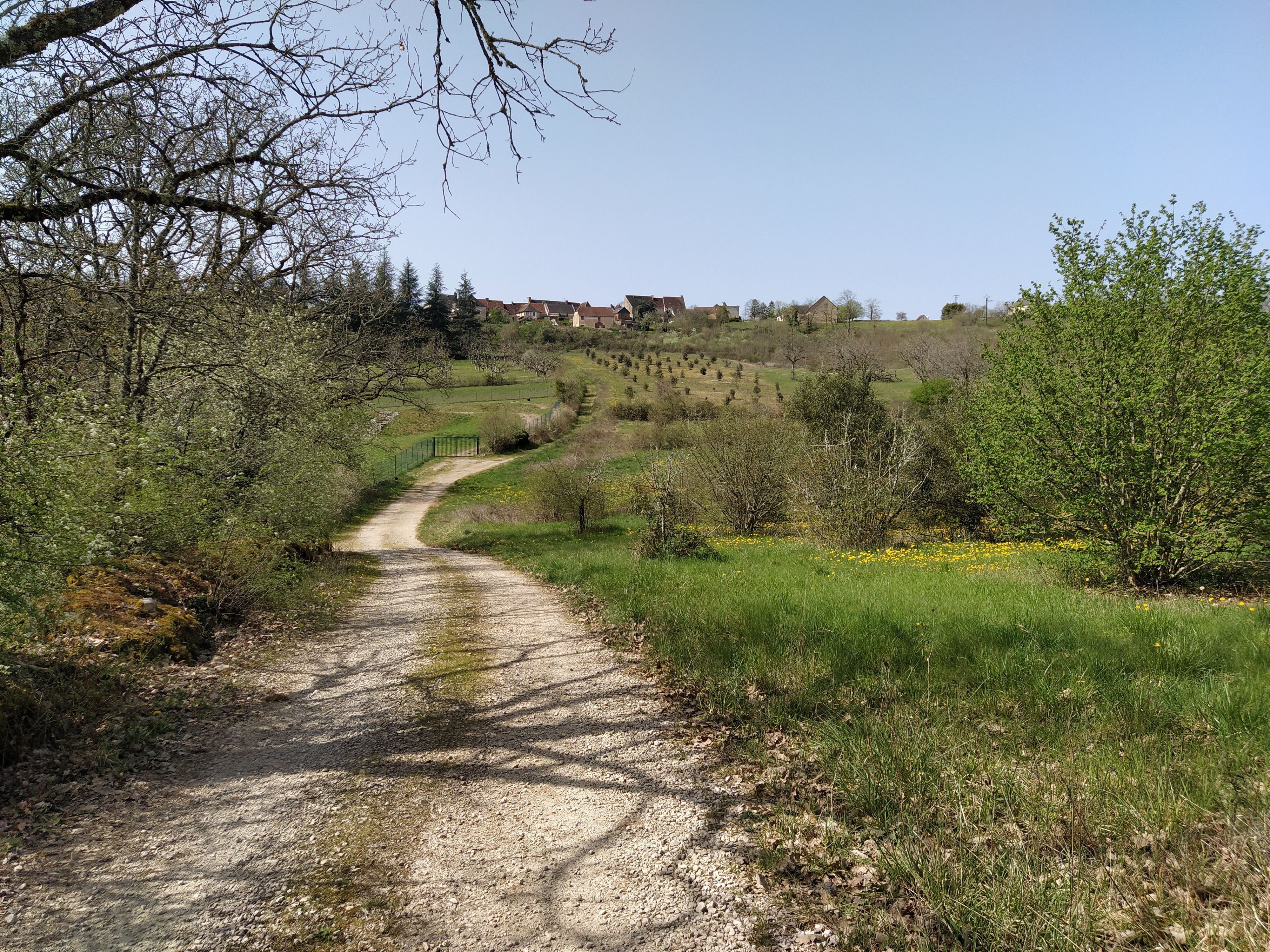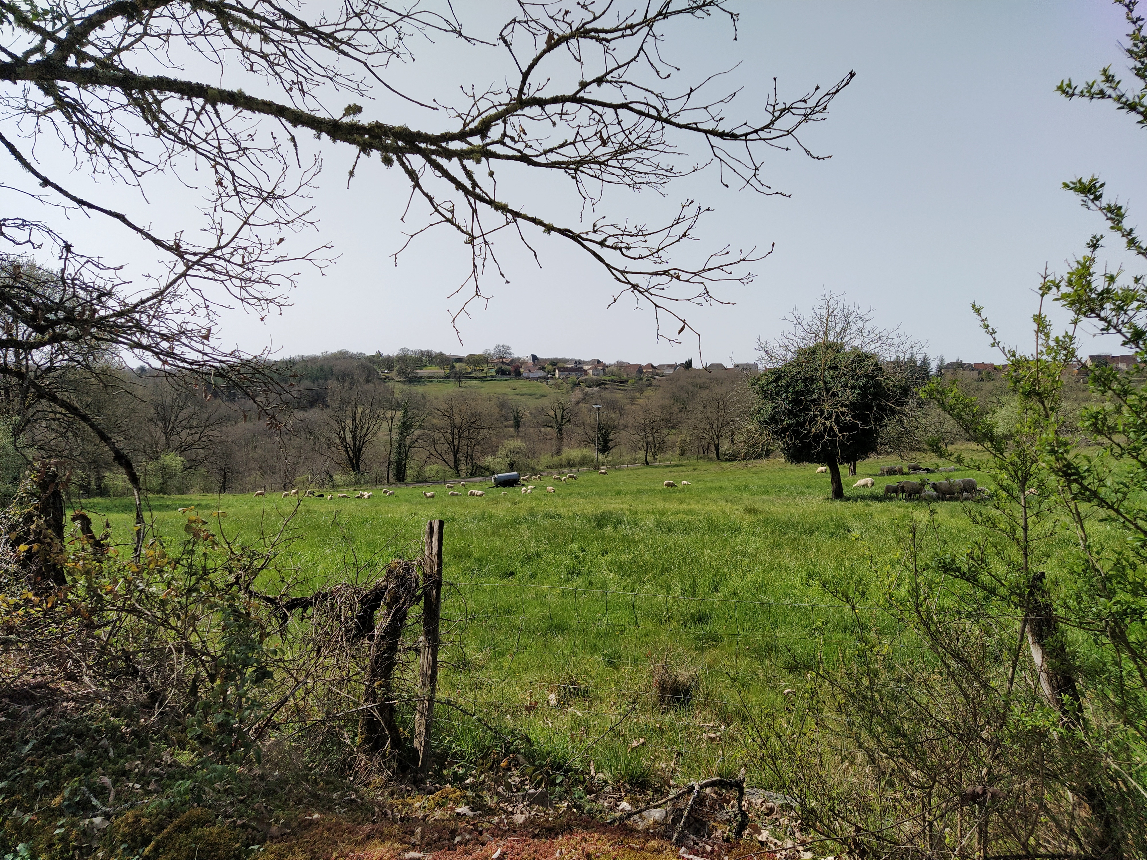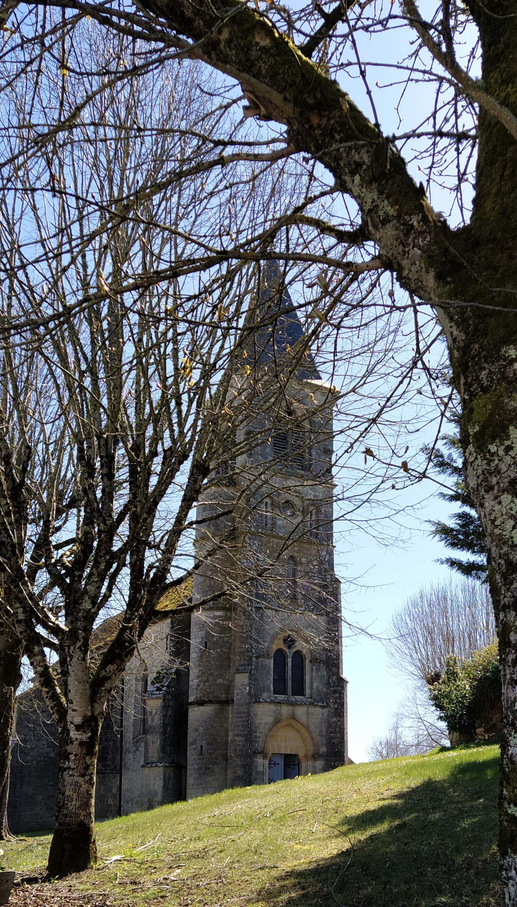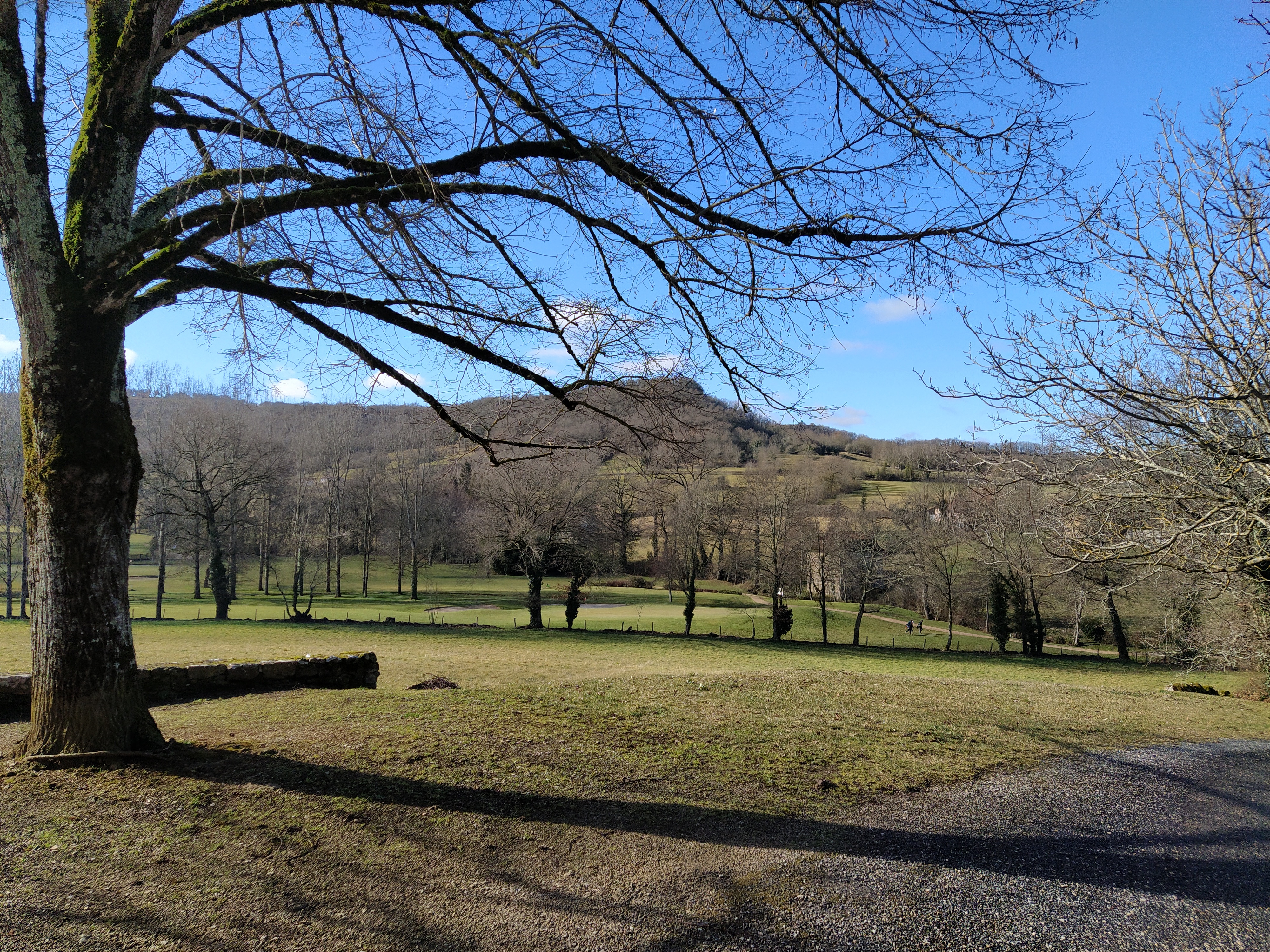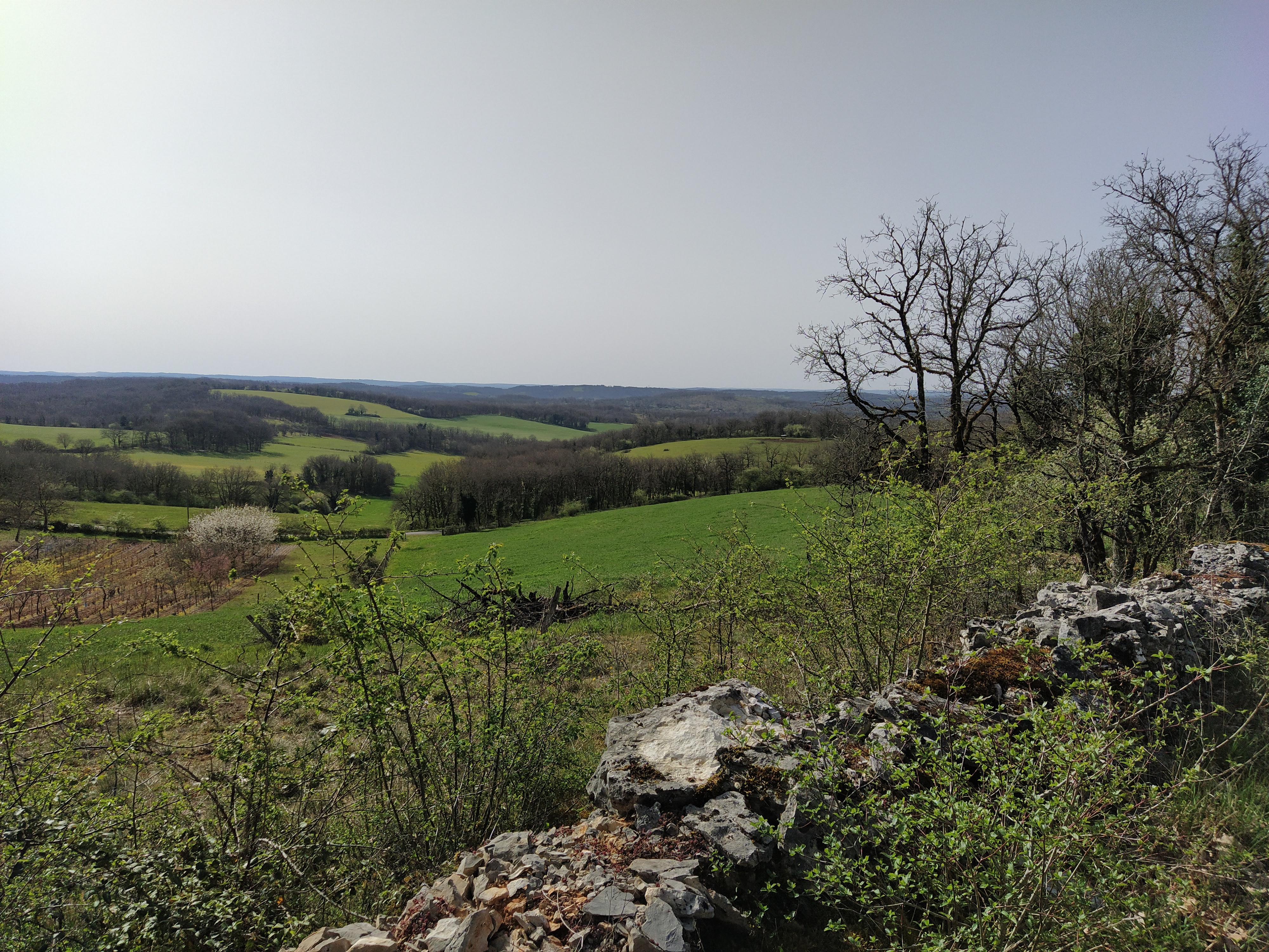 Having climbed up the village High Street we were directed down a minor road that followed the river with stunning views back towards the village church. The summer heatwaves had stopped us walking very far as it was so unpleasant but this was perfect. Soon we were climbing a hollow way slippery underfoot with fallen leaves. My ‘fiche’ told me this was the most difficult part. It soon opened out onto a cart track between fields. Used to walking on our beautiful but dry limestone causse, to be surrounded by green arable land was heavenly. I watched as a buzzard skimmed the treeline in the distance. Later, a smaller raptor took off from our left calling crossly as it did so.