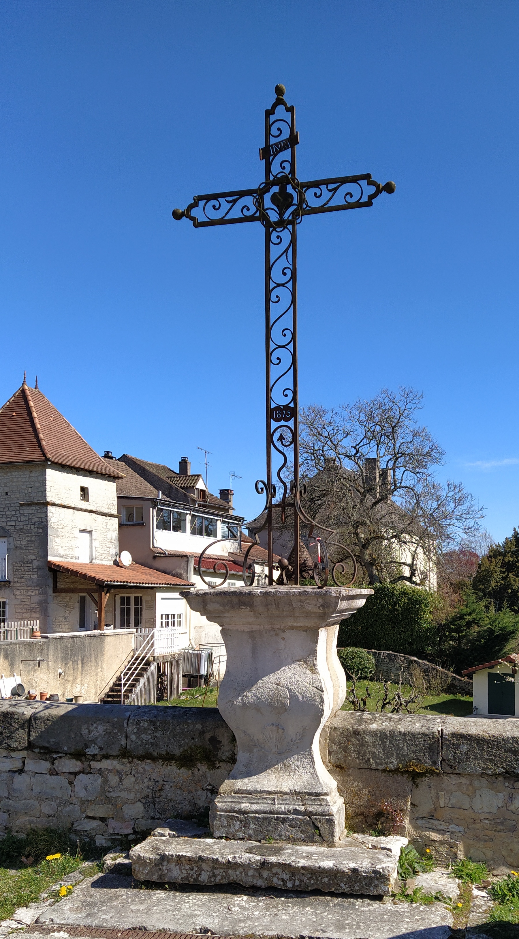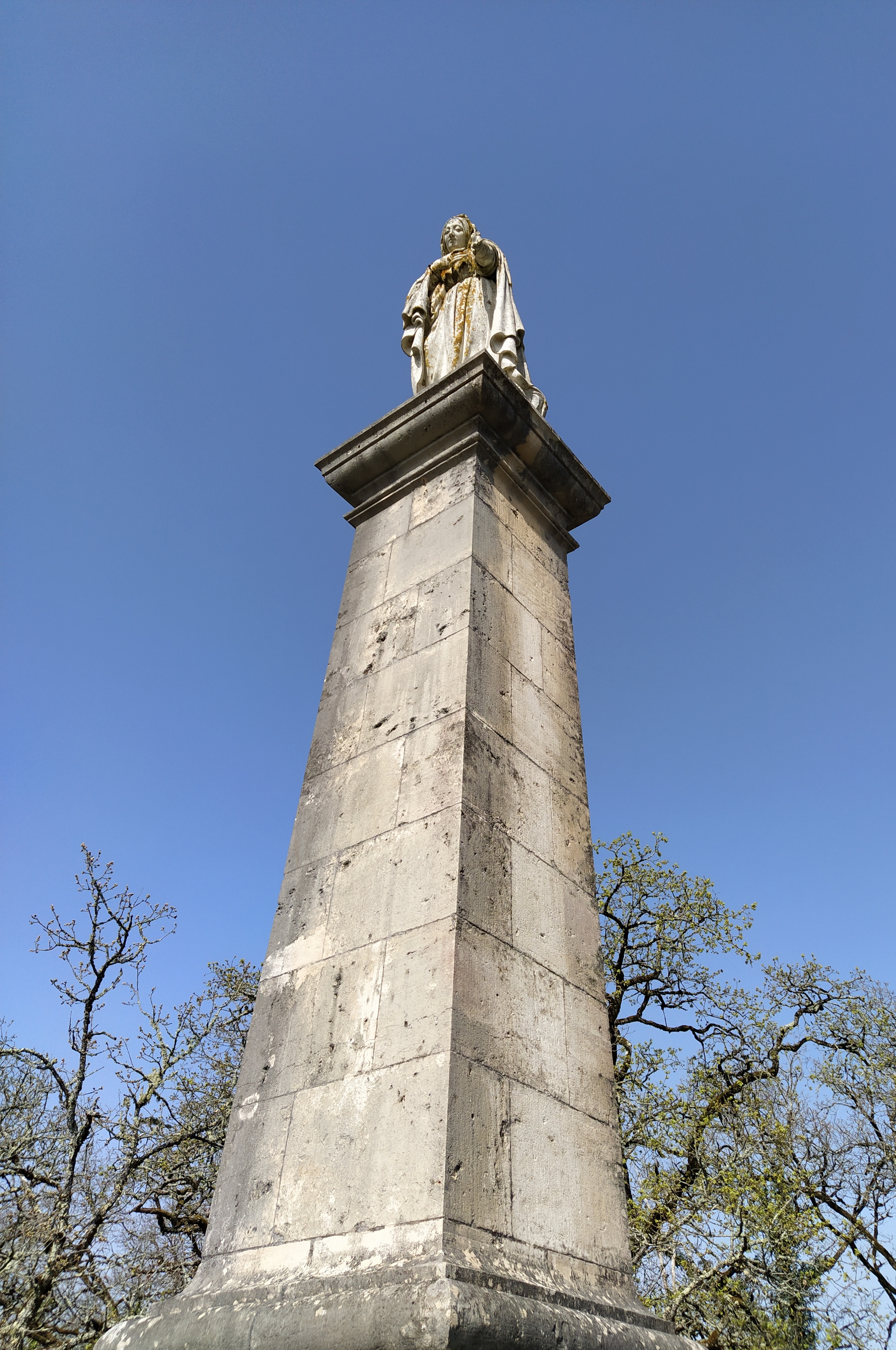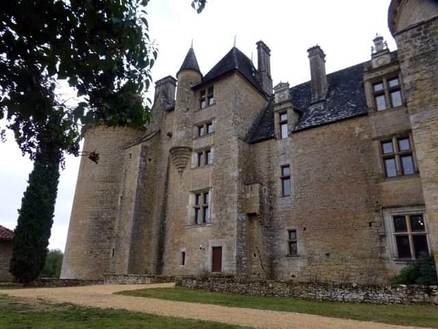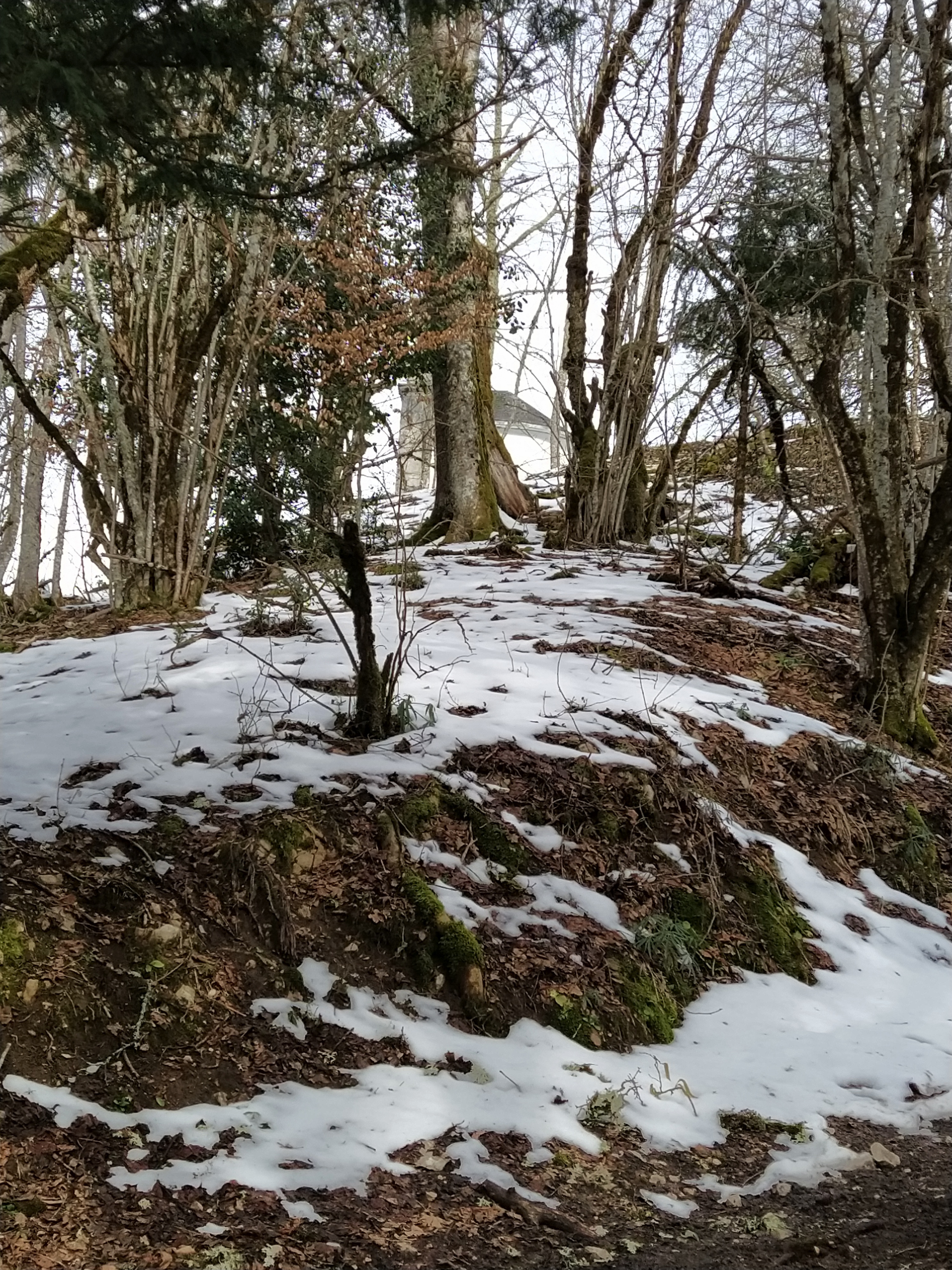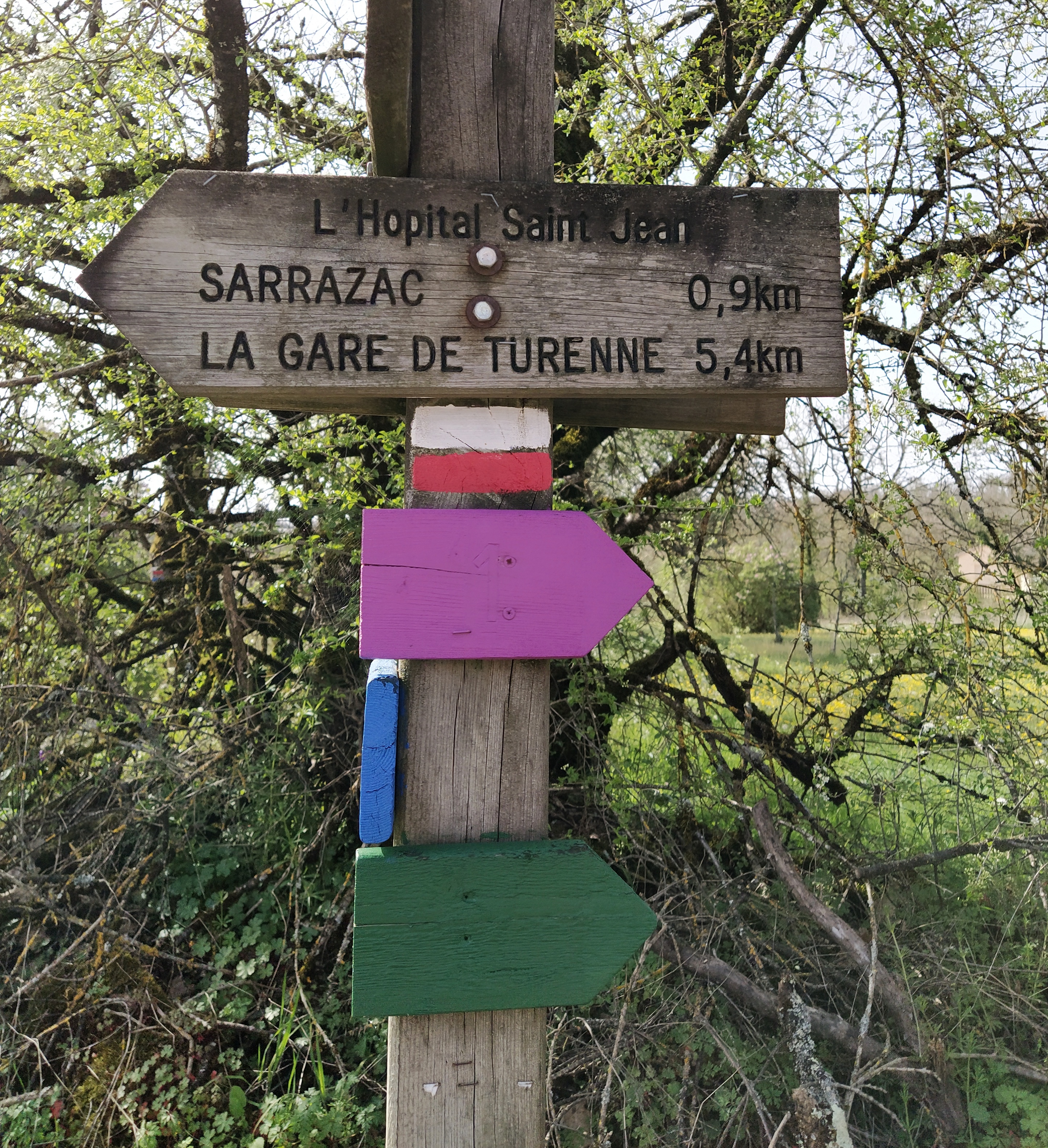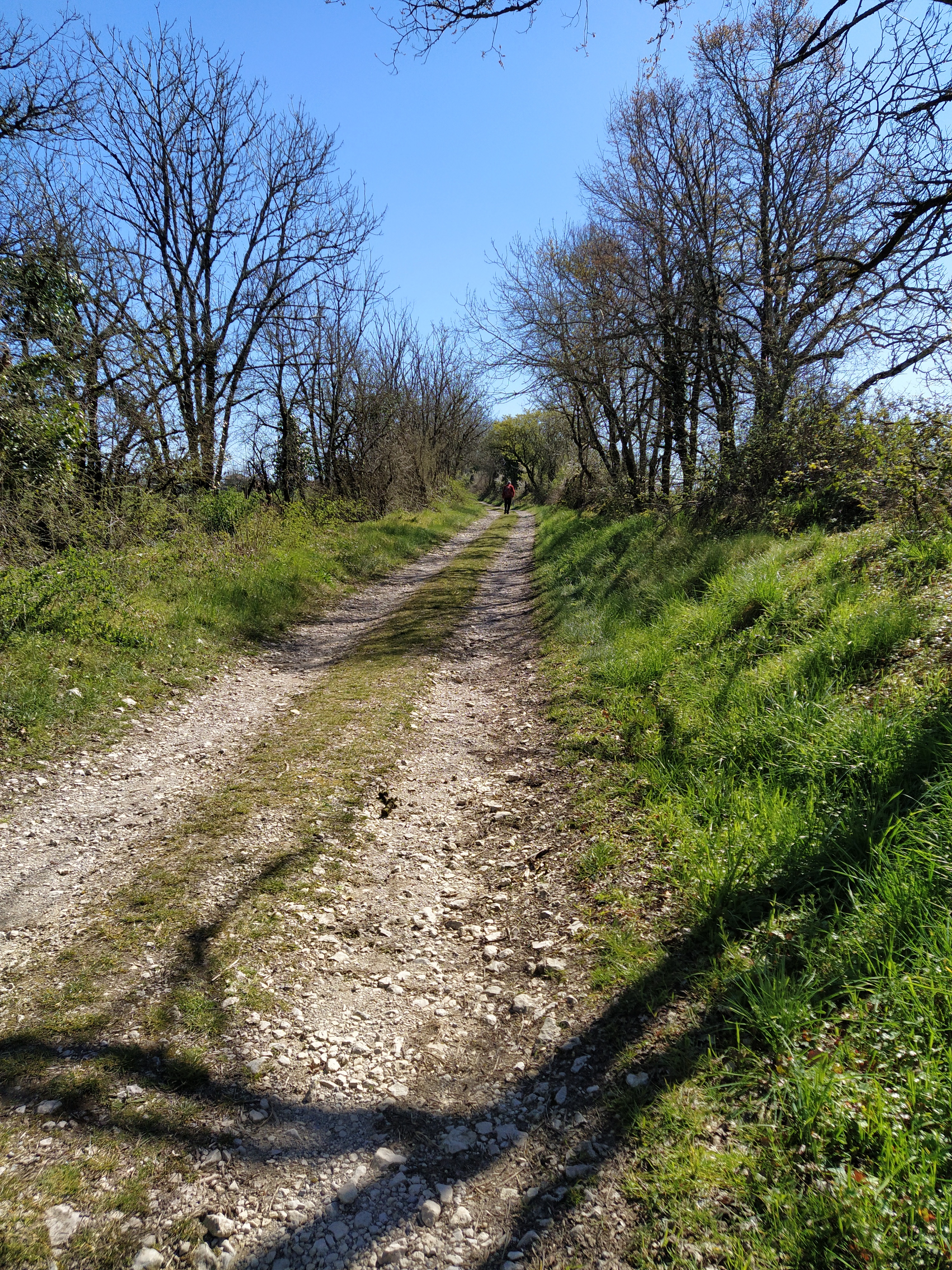 Having climbed up the village High Street we were directed down a minor road that followed the river with stunning views back towards the village church. The summer heatwaves had stopped us walking very far as it was so unpleasant but this was perfect. Soon we were climbing a hollow way slippery underfoot with fallen leaves. My ‘fiche’ told me this was the most difficult part. It soon opened out onto a cart track between fields. Used to walking on our beautiful but dry limestone causse, to be surrounded by green arable land was heavenly. I watched as a buzzard skimmed the treeline in the distance. Later, a smaller raptor took off from our left calling crossly as it did so.