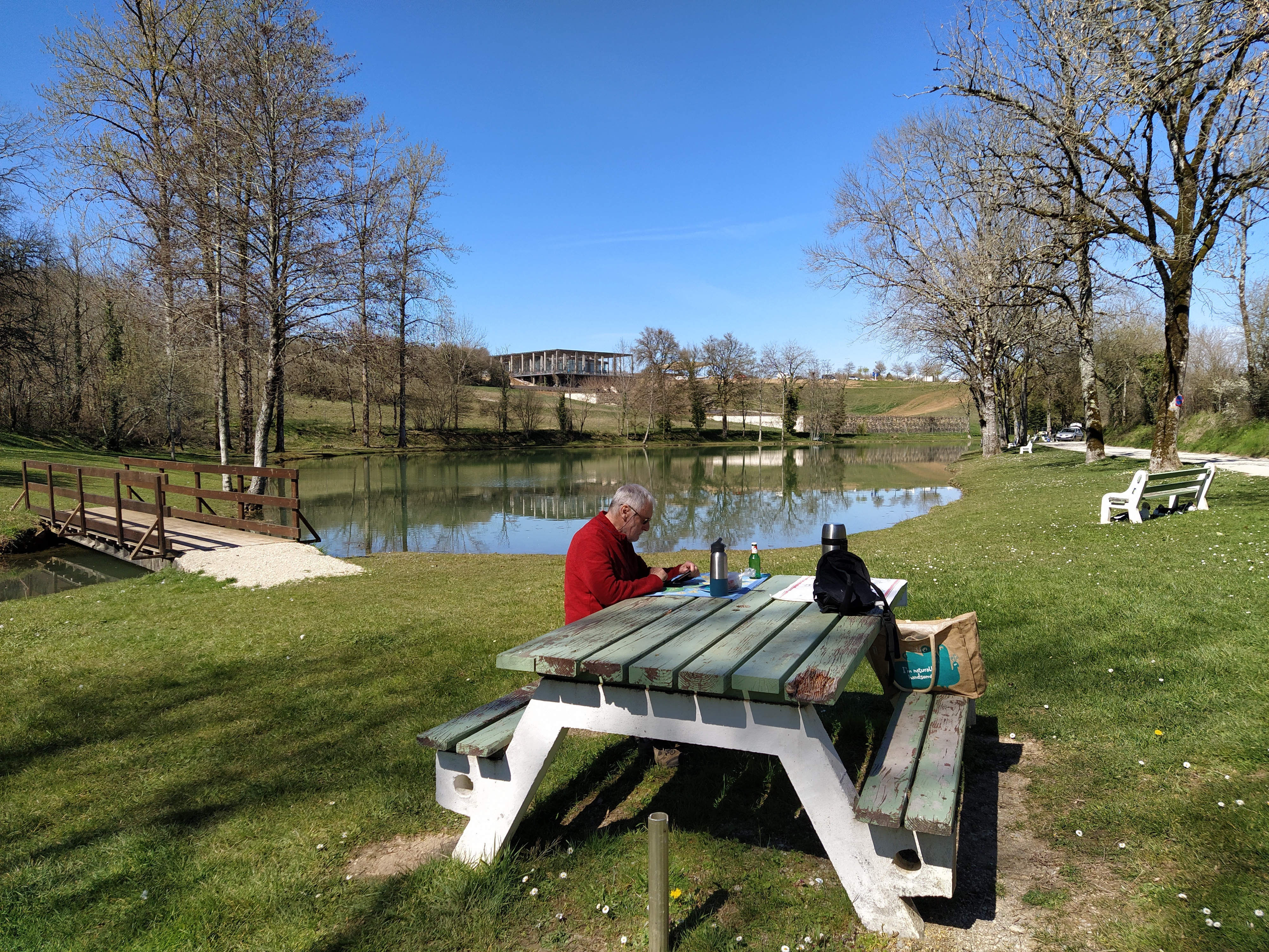 One evening we walked to the end of the campsite and found the swimming hole enshrined in the campsite’s name, ‘camping de la baignade’. It was dry so we continued along the pretty path to the bridge. People were walking their dogs or quietly contemplating the river where someone was fishing from a boat.