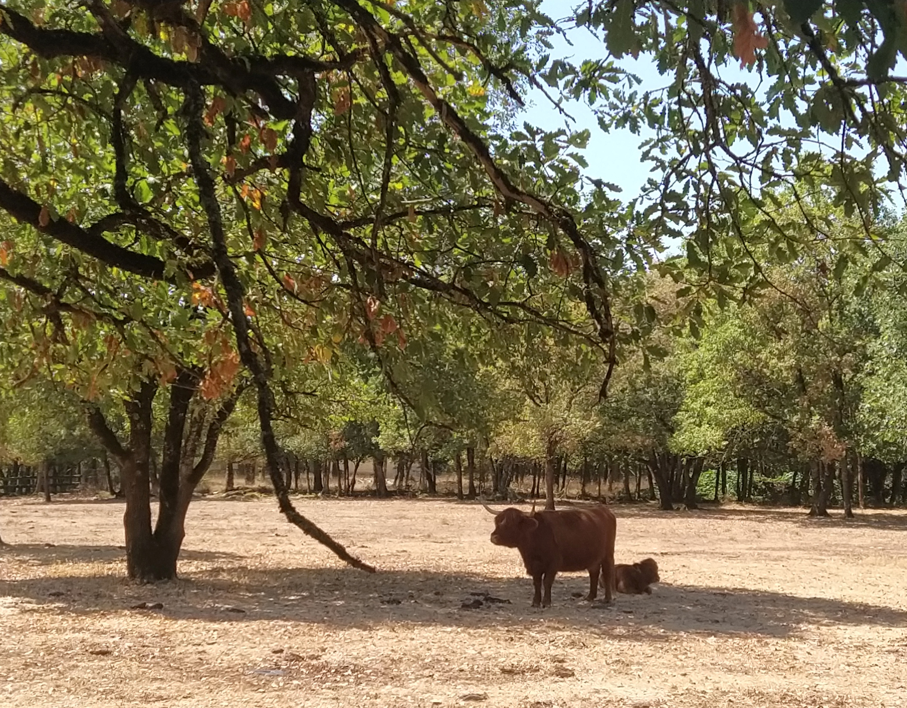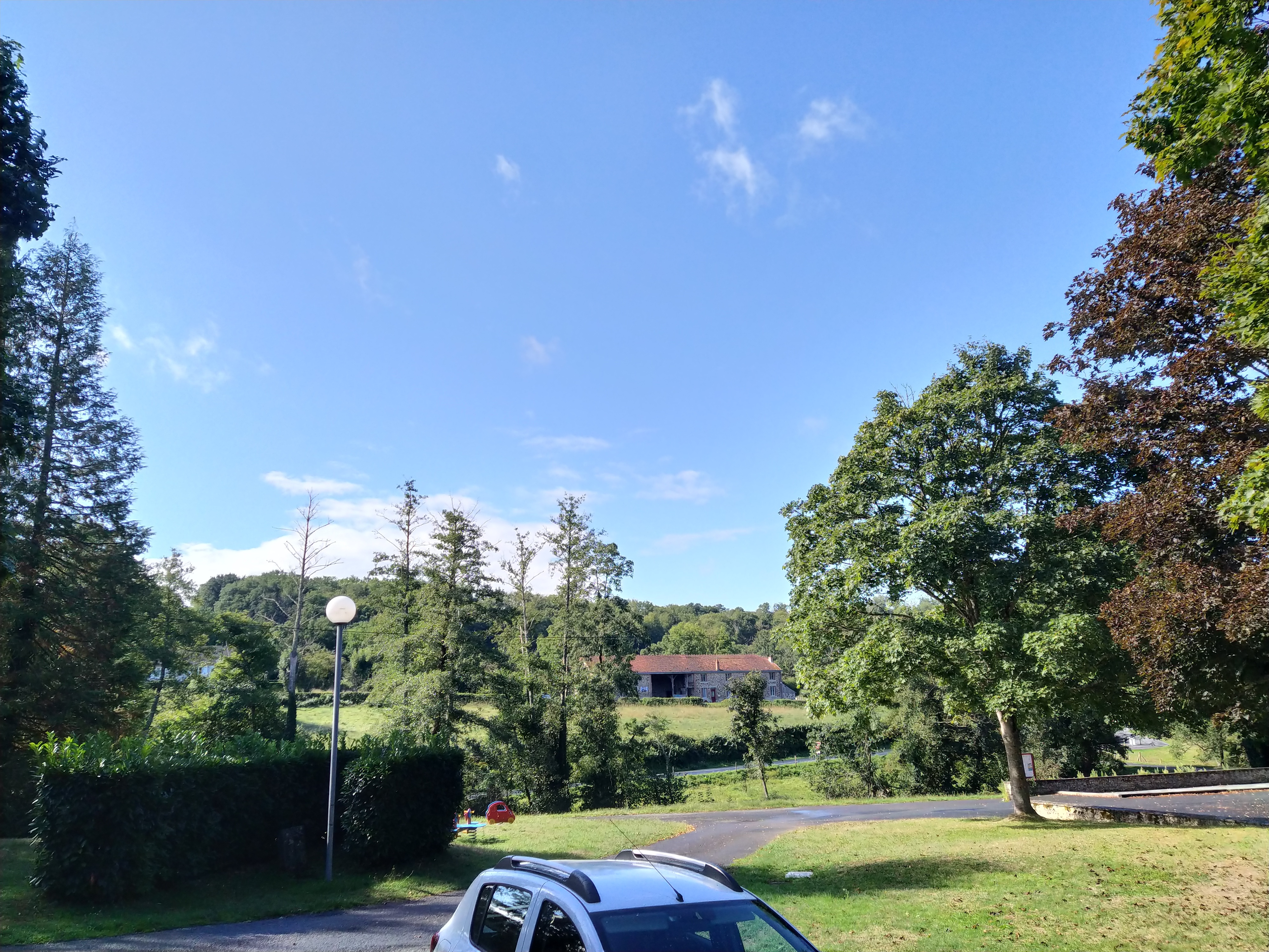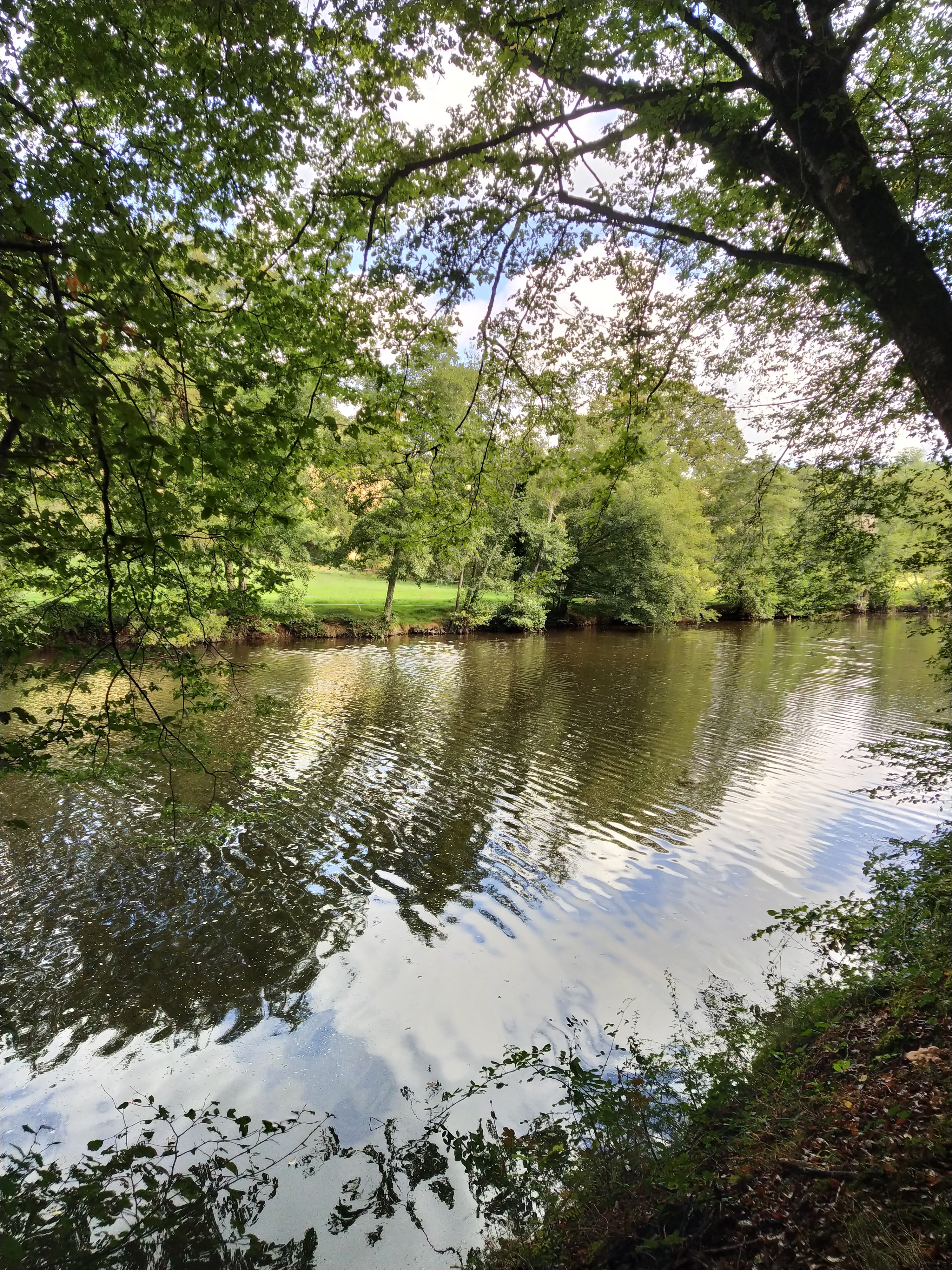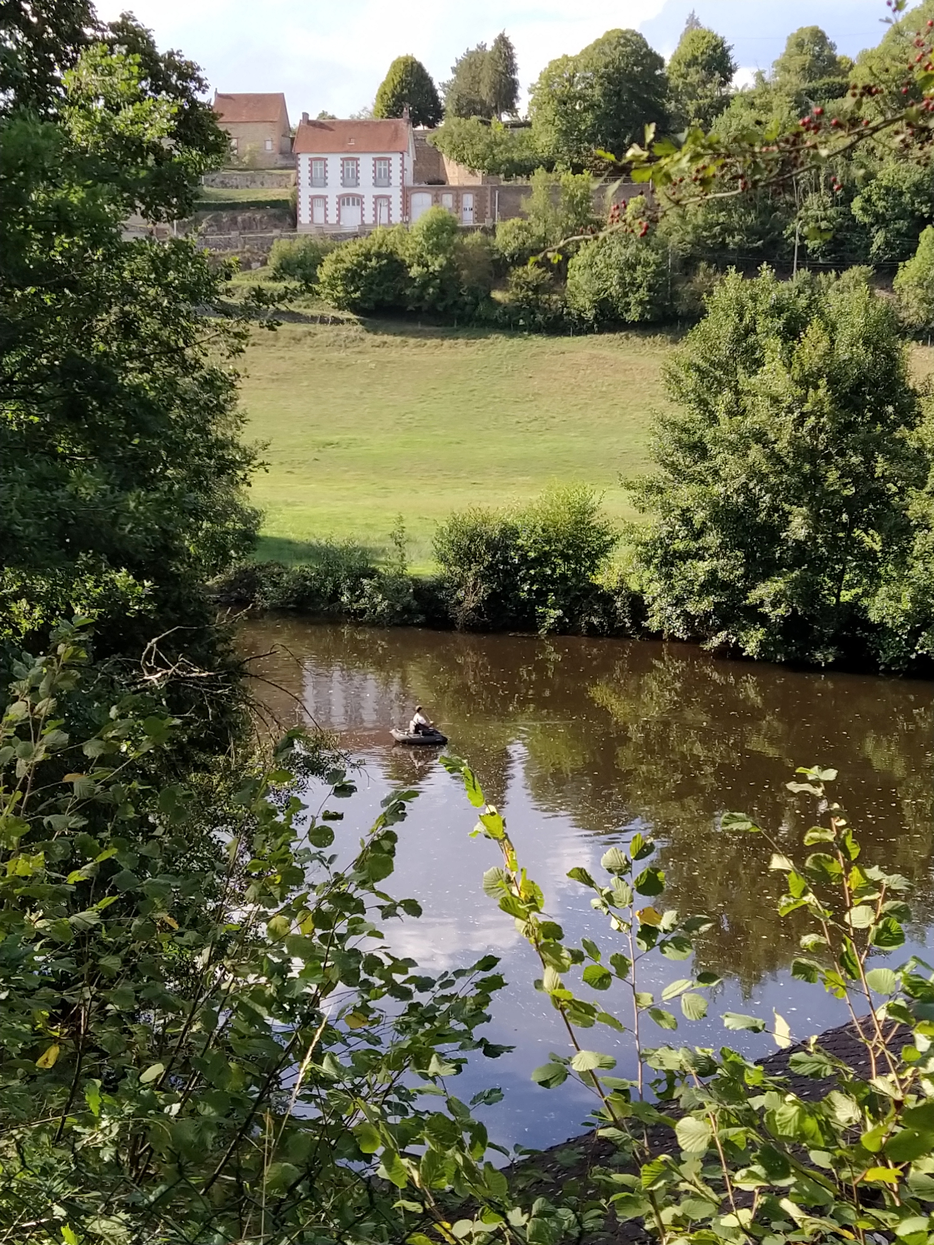After a lovely july and august busy with family, I approached the impending chalet stay with some trepidation. After a hot, dry summer the meteo was promising a week of dreadful weather plus the mairie website had a not very good photo of the chalets and I was anxious that I had booked an elderly and maybe an over used and tired holiday home. I needn’t have worried. After our gps did its usual ‘all round the houses by goat track’ approach we descended a hill to the Creuse with the handy auberge on our left and the campsite just beyond. The chalet was on the top of a rise with the river behind and below it. Great, not too many mozzies and only a small risk of flood if those storms arrived. The campsite rolled gently away from our veranda with a view of a small valley. A dried out stream ran from left to right along the bottom of the slope.