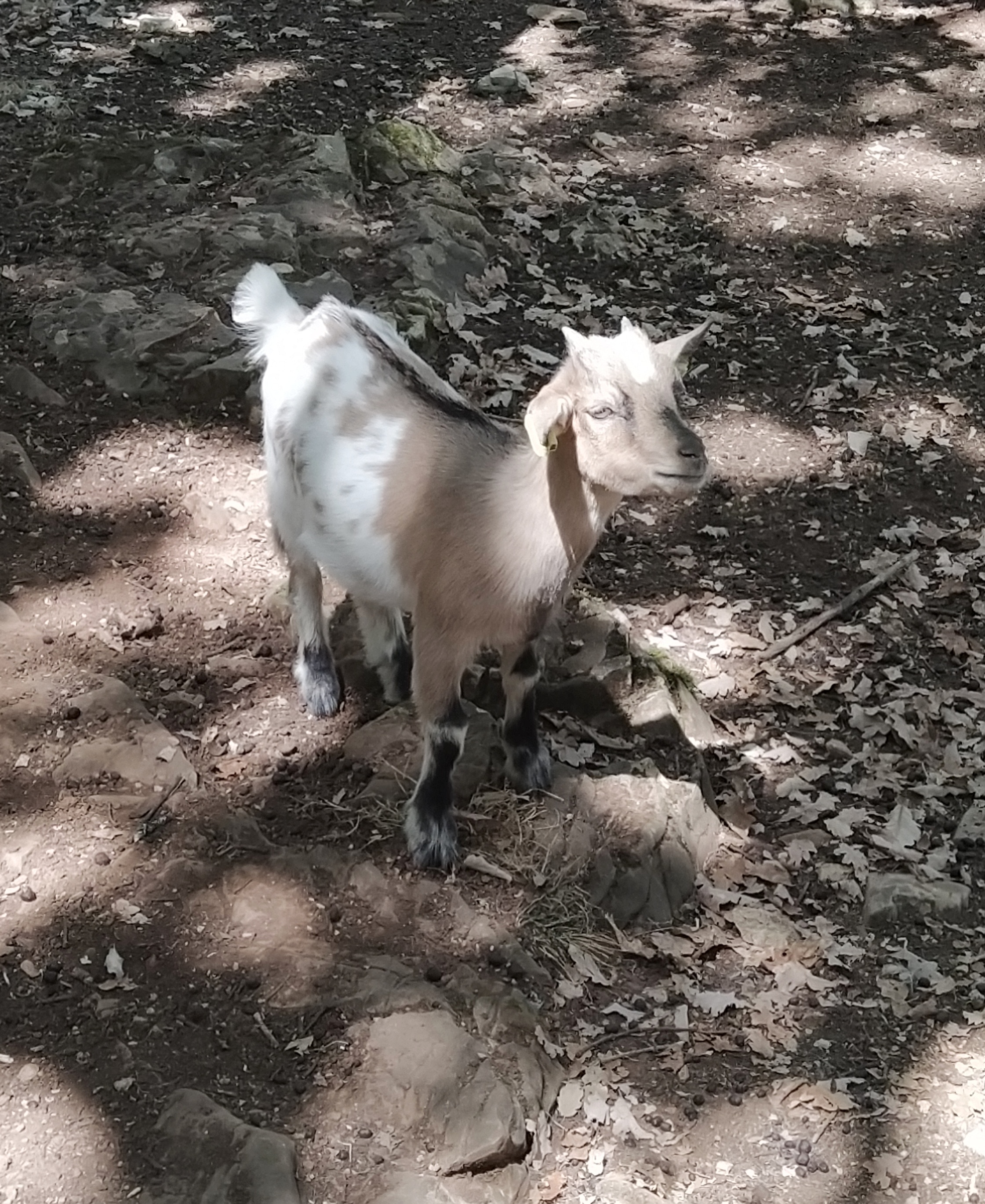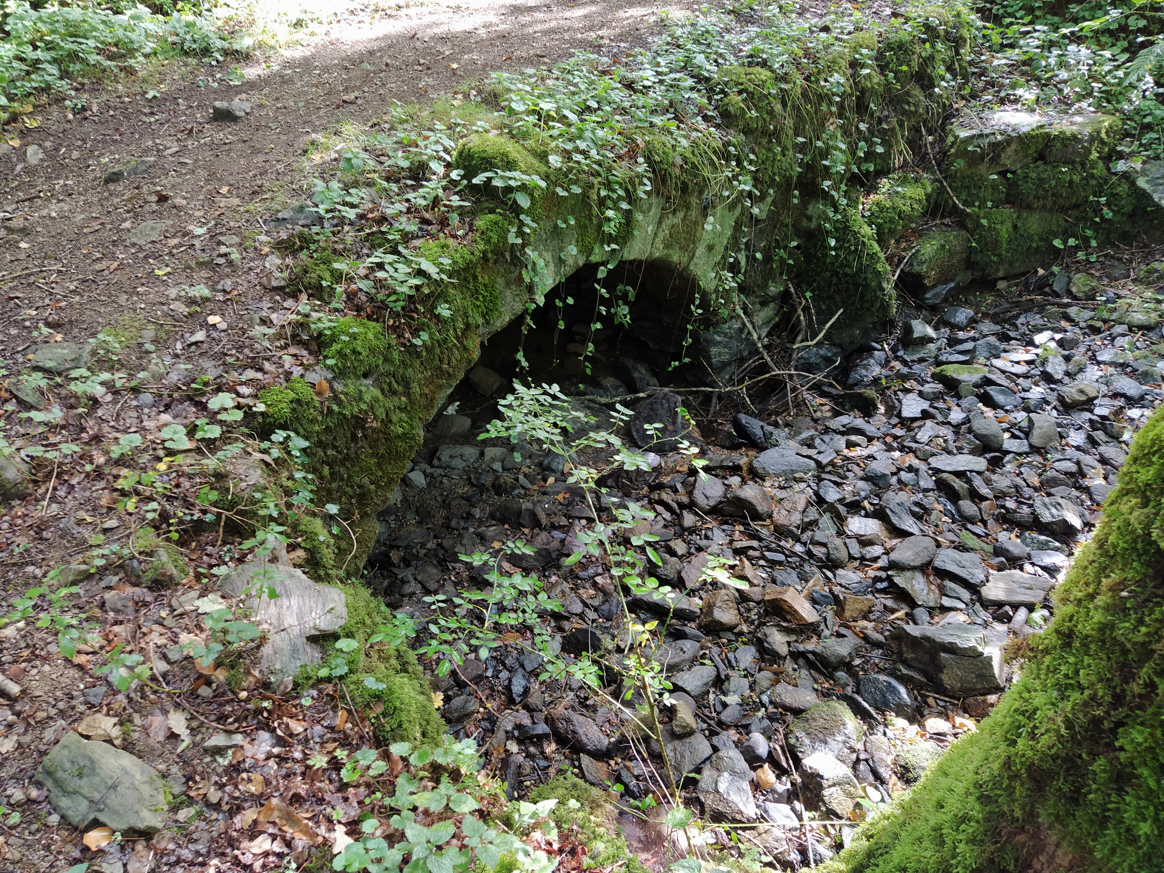 Studying the route I had suggested we turned back at a stone bridge over a stream running from our right called the Chantadoux which sounded very pretty. Firstly, all we found of the stream was a dry and rocky bed and then the expected bridge was barely visible being the same height as the path we were on. I hopped down to take a look and spied a curve of stone under a blanket of green moss and trailing ivy.