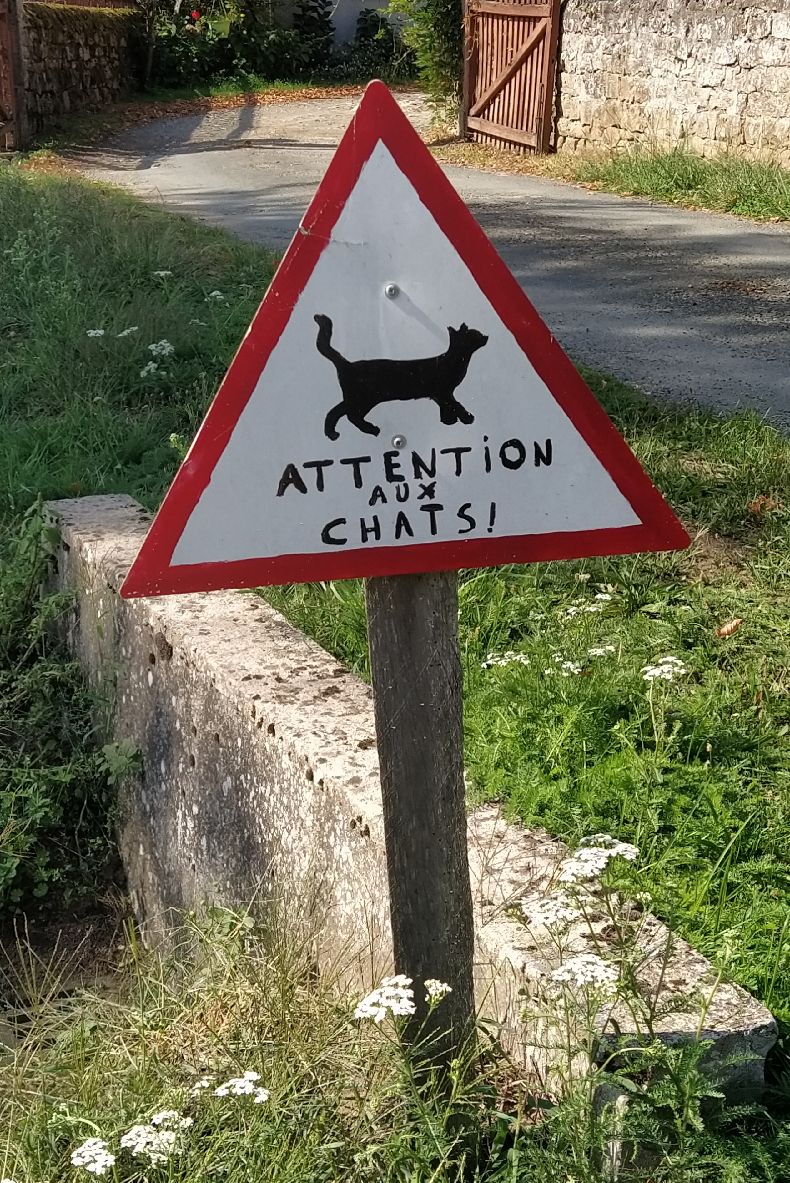 At the highest point we walked along a grassy track with views stretching for miles to left and right. Then it was down again through a small hamlet where a sign warned drivers to mind the resident cats.