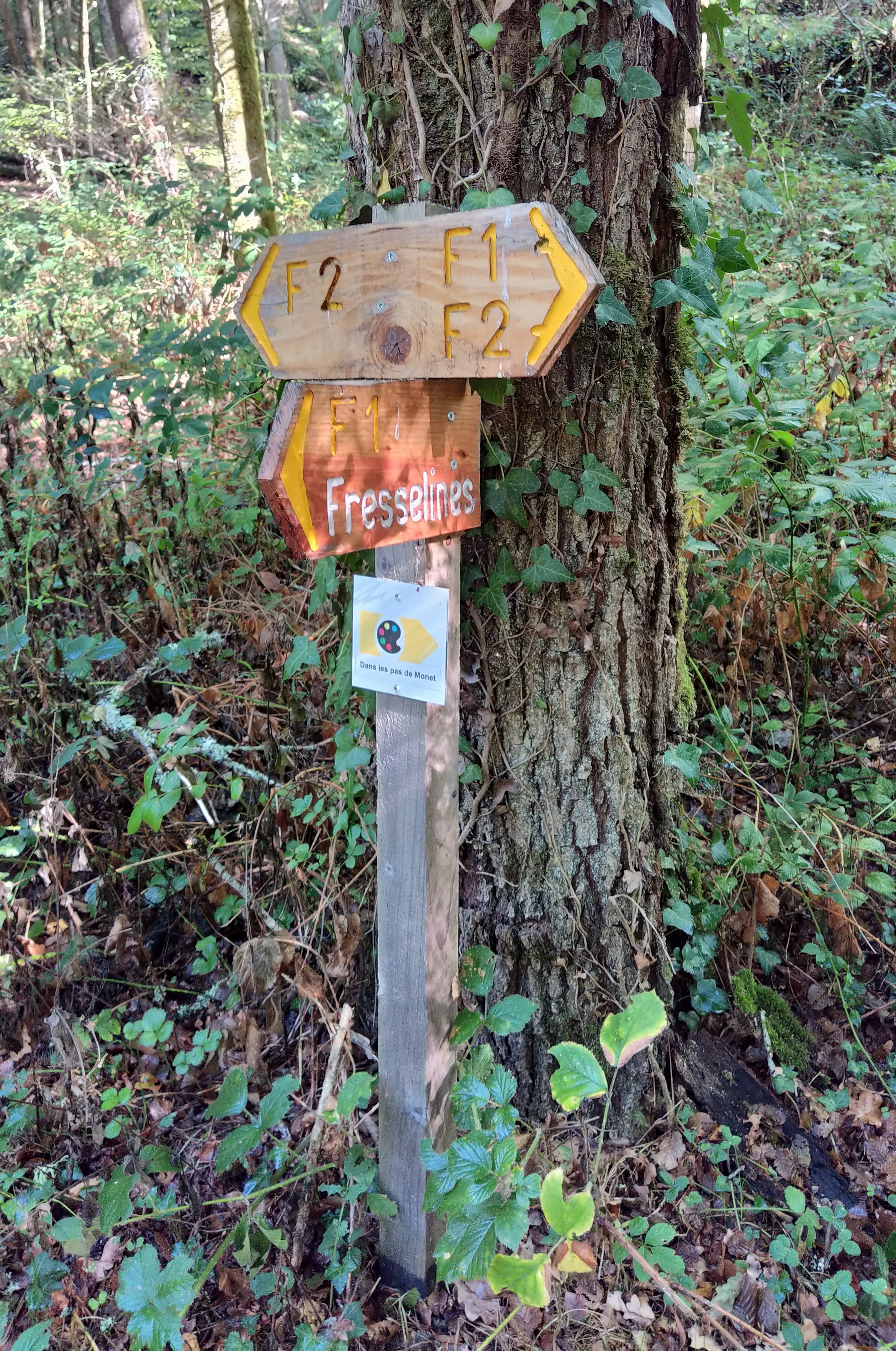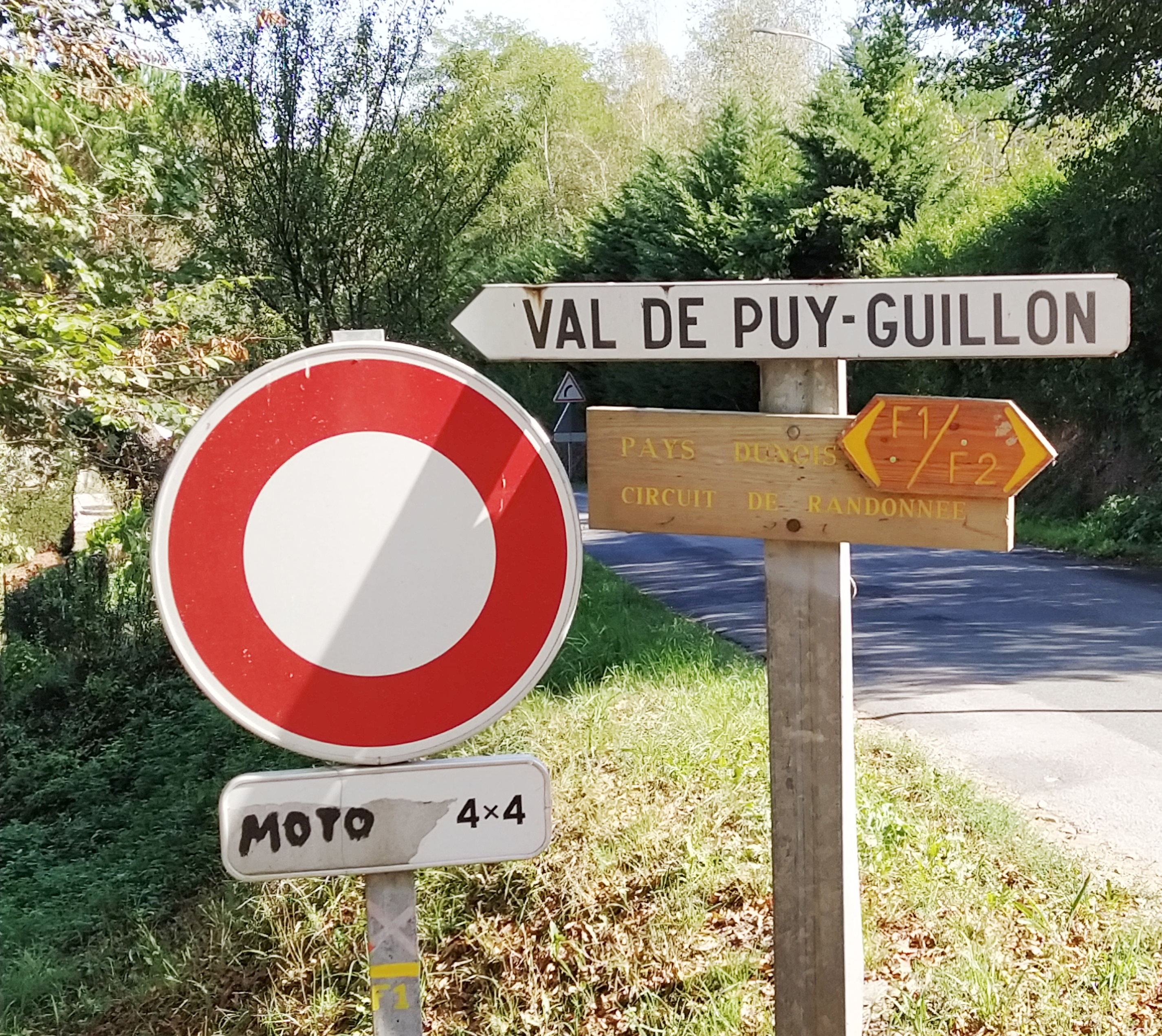 …we began the steep climb back out of the river valley just as I had foreseen. More of a gorge at this point of the Petit Creuse. We came out on a road on the opposite side of Fresselines from where we had started. Of course, there were also loads of signs this end of the walk telling us where we had just been…