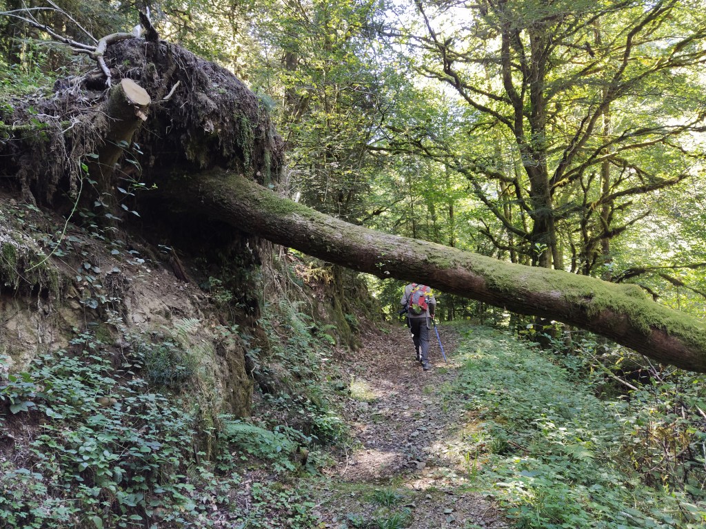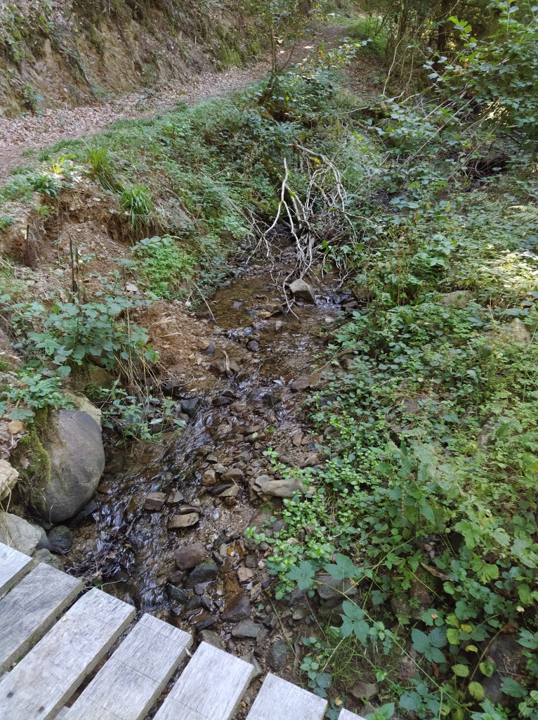 Further down we crossed a small fast running stream and climbed up to a junction with more yellow signs.
