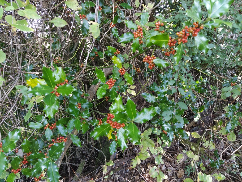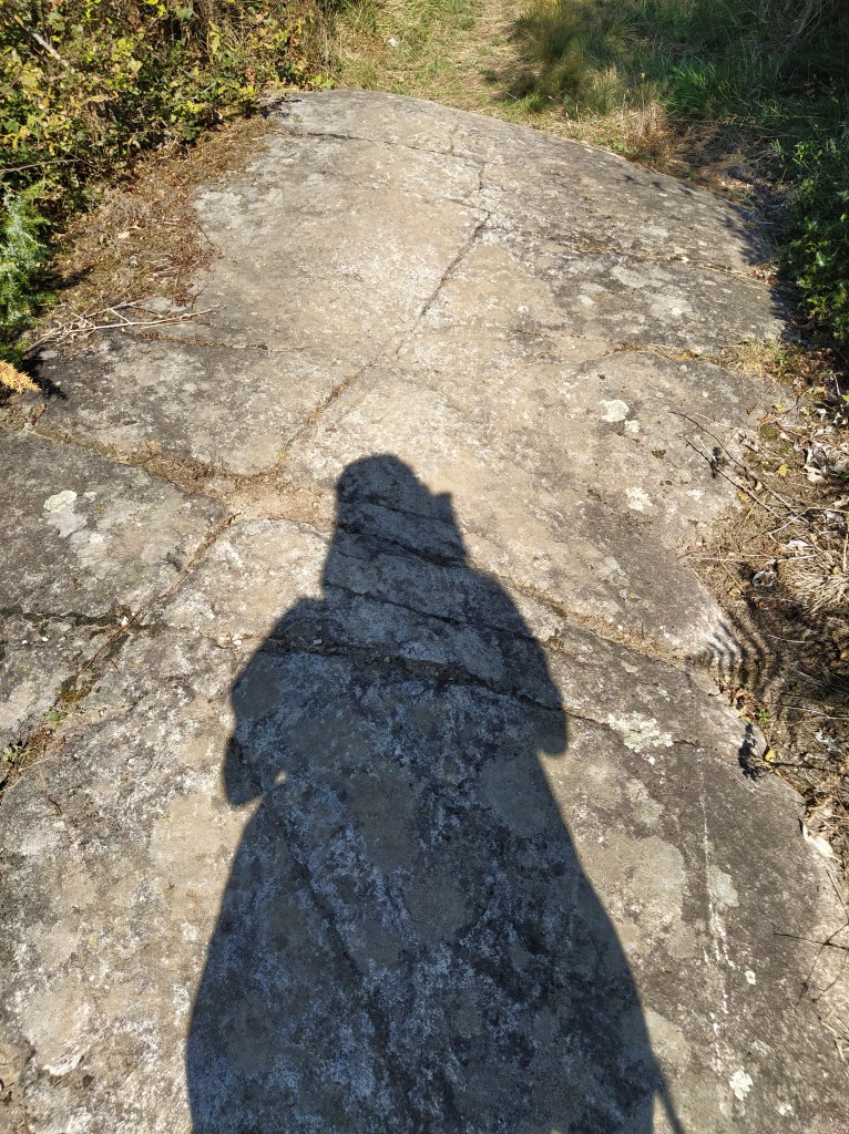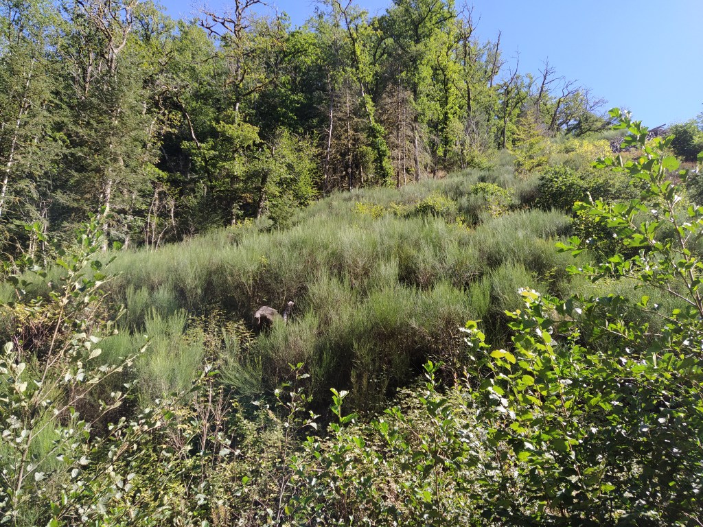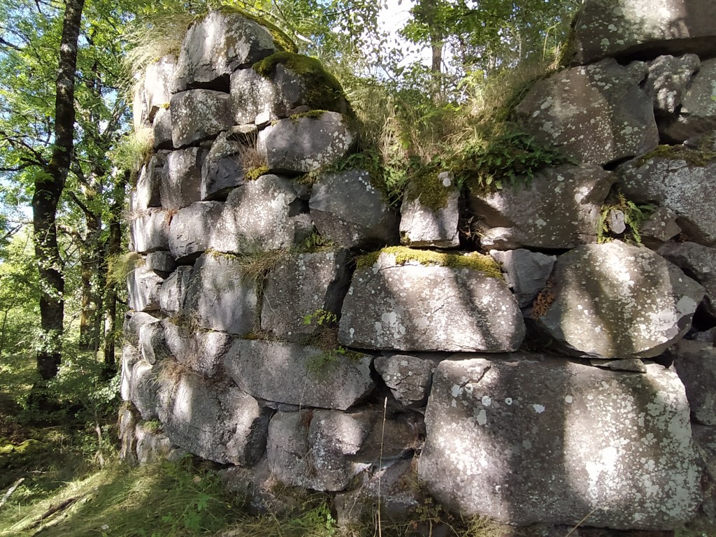From reading the board I knew that there was only the remains of a tower from the chateau and looked around for it. Hidden in the trees and up a slope it could just be seen. Ever the curious one (nosey, himself says) I scrambled up with the help of my trusty stick and investigated the ‘vestiges’.