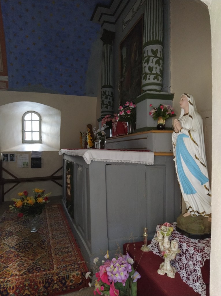 Sadly, the chapel was shut but its two side windows were open so some shifty poking of my phone through them revealed something of the interior.